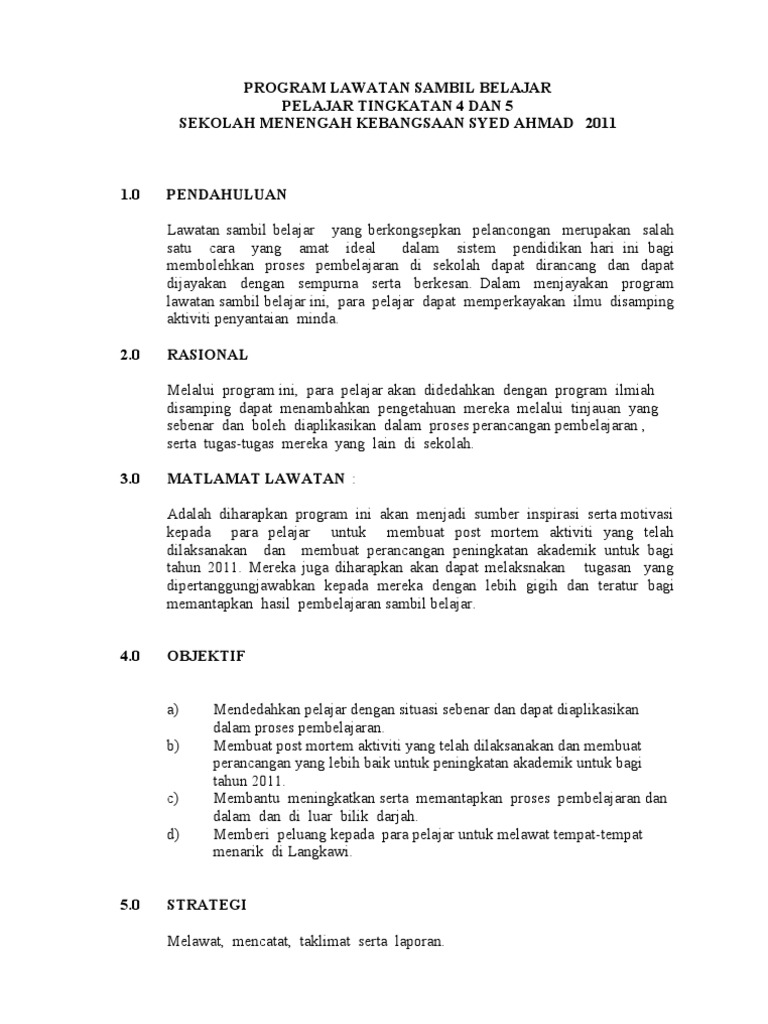 23 Senarai Nama Murid dan Guru Pengiring yang lengkap 24 Surat Memohon Kelulusan Mengadakan. Percubaannya menjual kain pasang yang dibeli oleh suami dari luar. Sekolah bertanggungjawab melaksanakan serta menanam konsep lawatan dalam negeri dengan tujuan untuk memberikan pengalaman kepada murid.